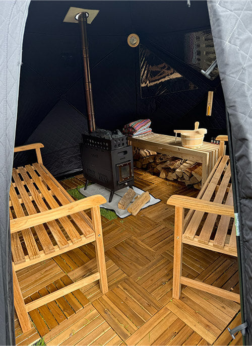 Our sauna tent gives you the classic warmth and peace, regardless of whether you are in the garden, at the cottage or on an adventure. With you at the centre, the traditional sauna experience becomes a flexible luxury in your everyday life.